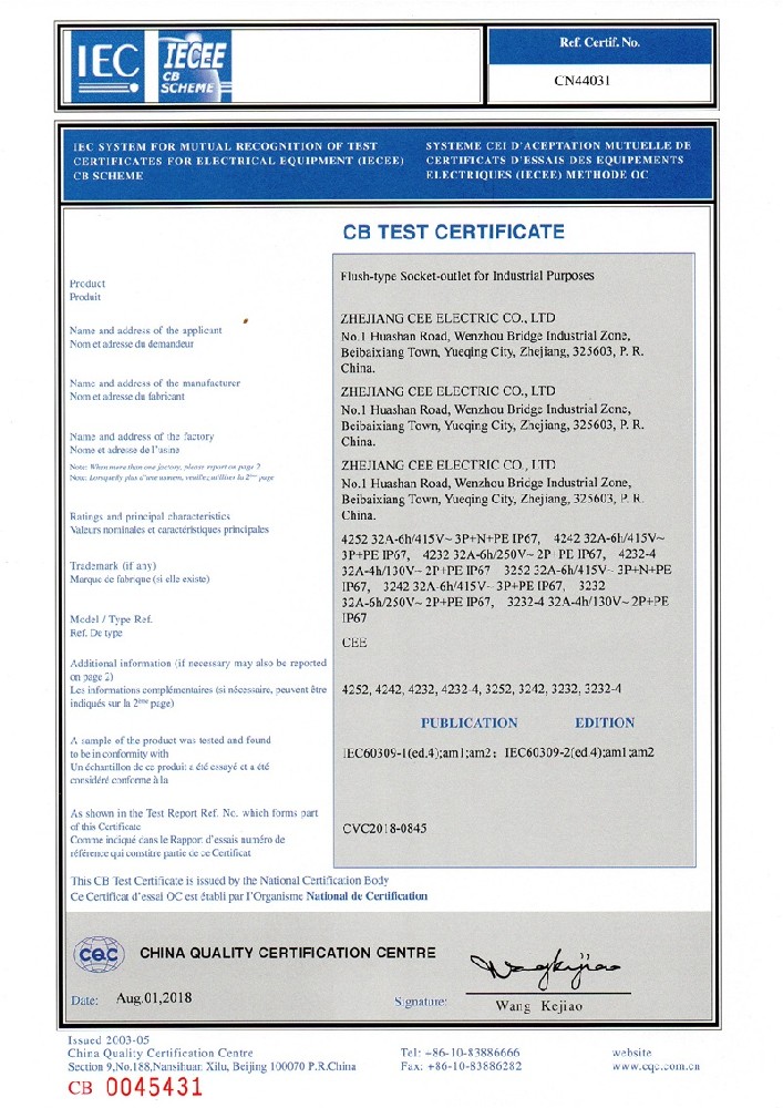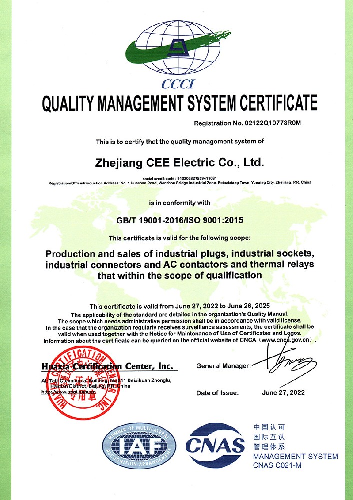 公司全面貫徹實施IS09001:2015質量管理體系認證。工業插頭插座符合IEC 603 09-1-2, EN 60 309-1-2國際標準, 組合插座箱符合EN61439標準,并通過Intertek & TUV Rheinland & CQC等認證。證書包括TUV、SEMKO、CE、CB、EAC,并符合RoHS和Reach等適用法規。公司引進先進生產設備和精密檢測試驗儀器、不斷引入高科技工藝流程和技術人才,為公司的產品研發、質量升級、管理創新提供了強有力的保障。公司將持續以優質的產品和服務,贏得客戶的最大滿意為宗旨,發揚“創新、服務、溝通”的企業精神,力促CEE品牌從中國走向世界。我們牢牢把握時代賦予的使命和機遇,與海內外合作伙伴共同開創事業的新高度。